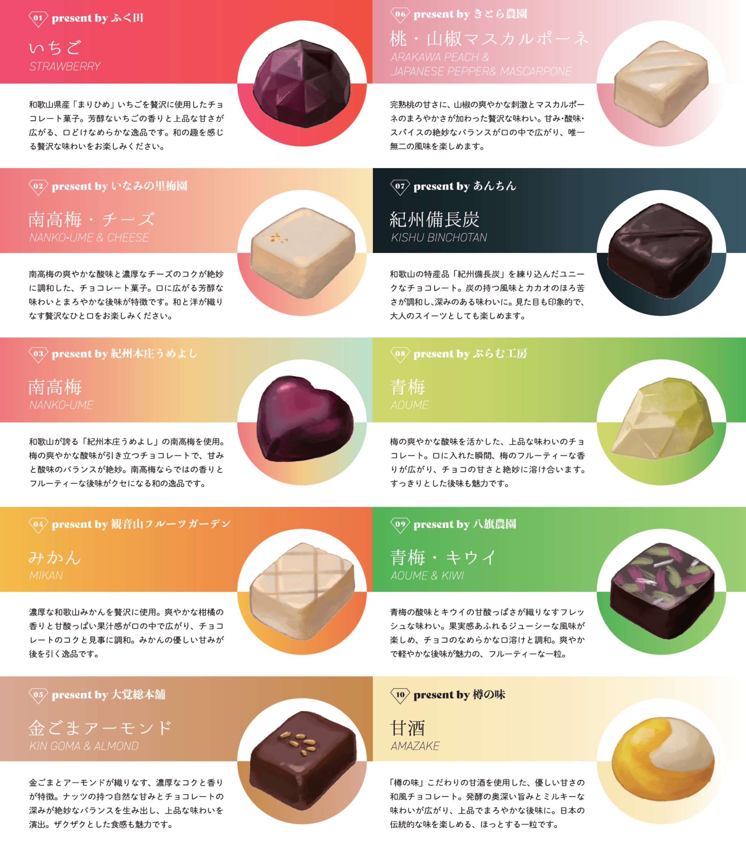 和歌山の豊かな恵みを詰め込んだ「Jewel Boxes」は、10種の個性豊かなチョコレートを楽しめる特別な逸品。南高梅やみかん、紀州備長炭など、地元の素材と職人の技が融合し、新たな味わいを生み出しました。